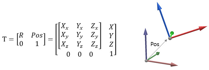 3차원 vector 끝에 1을 추가하여 동차 좌표라고 하는 4차원 벡터로 변환한다. 4차원 벡터의 경우 행렬에 회전 및 병진을 포함하여 작성할 수 있다. 이 행렬 $\mathbf{T}$를 변환 행렬(Transform Matrix) 라고 한다. Transform Matrix는 왼쪽 위 모서리는 회전 행렬, 오른쪽은 병진 벡터, 왼쪽 아래 모서리는 0 벡터, 오른쪽 아래 모서리는 1이다 이와 같은 행렬을 특수 유클리드 군(Special Euclidean Group)이라고 하며 $SE(3)$으로 표기한다.