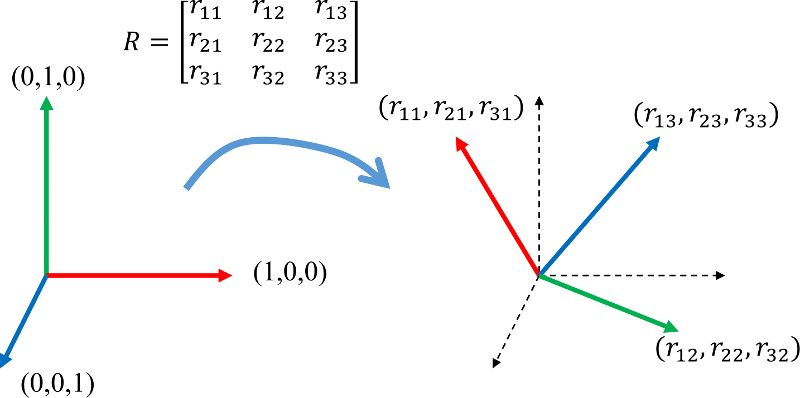 - 회전행렬의 inverse는 transpose와 같다. $\mathbf{R}\mathbf{R}^T = \mathbf{I}$