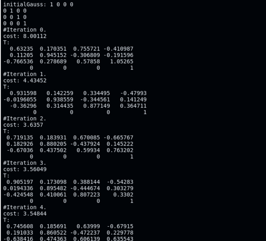 초기 로봇의 pose를 Identity Matrix로 정의한 뒤에 반복적으로 pose를 업데이트한다. 반복할수록 cost값이 최소화하는 방향으로 최적화되는 것을 확인 가능하다.
