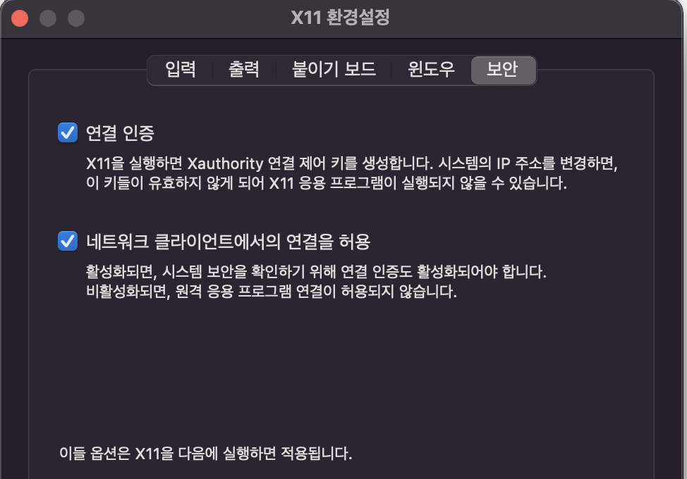 실행후 command + , 를 입력해 환경설정 > 보안 > 네트워크 클라이언트에서의 연결을 허용을 활성화해줍니다. 그다음 macos terminal에 다음 명령어를 입력해야 합니다