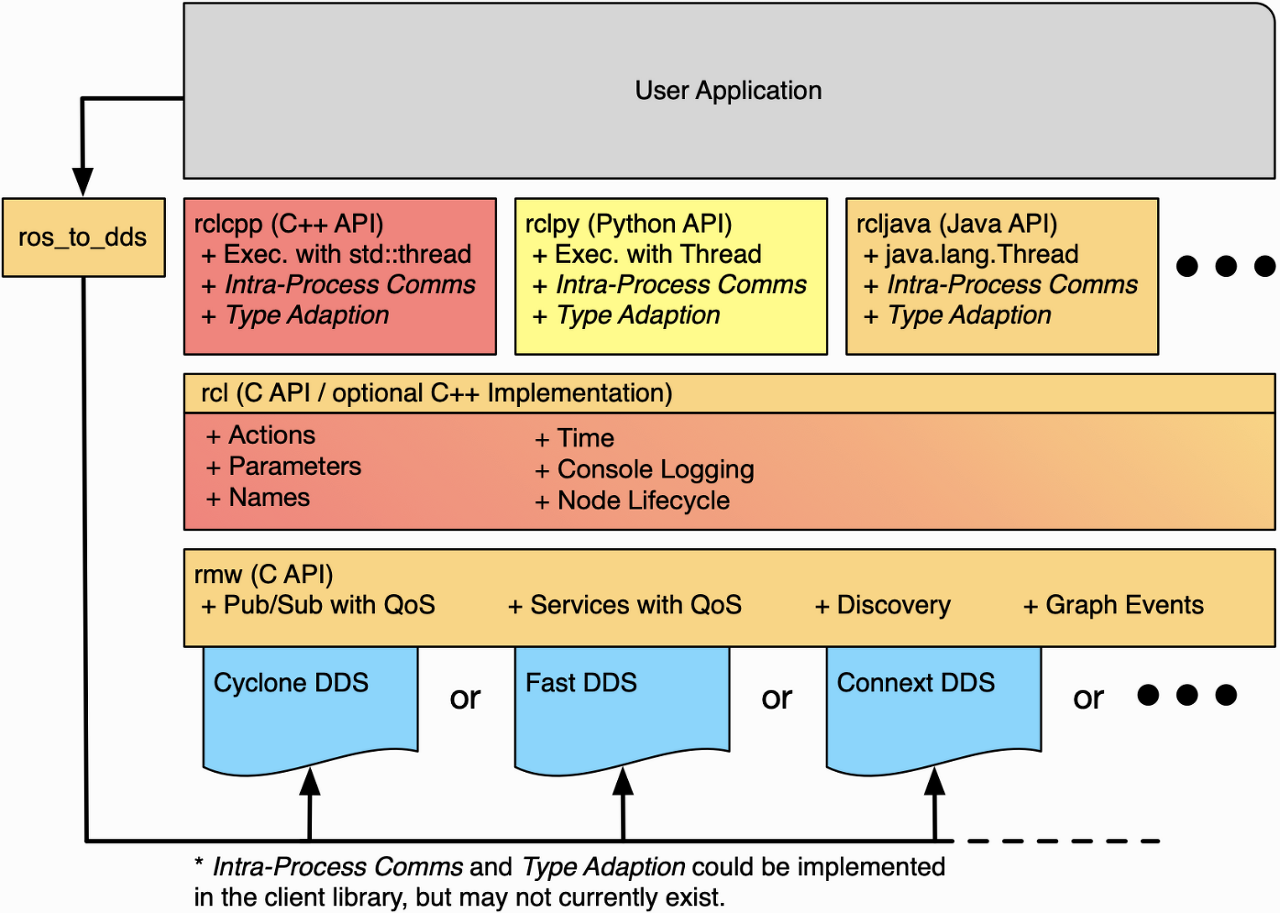ROS2๋ ๋ค๋ฅธ DDS์๋ ํต์ ์ด ๊ฐ๋ฅํ๋ค. ๊ทธ ์ด์ ๋ RMW(Robot MiddleWare)๊ฐ RCL(Robot Client Library)์์ ํต์ ์ ์ํด DDS ๊ตฌํ์ ๋ํ ์ถ์ํ ๊ณ์ธต์ ์ ๊ณตํ๊ธฐ ๋๋ฌธ์ด๋ค. (DDS๊ฐ ๋์ ๋๋ฉด์ ROS1๊ณผ ๊ฐ์ฅ ํฌ๊ฒ ์ฒด๊ฐ๋๋ ์ฐจ์ด๋ QoS ๋ผ๊ณ ์๊ฐํ๋ค.)