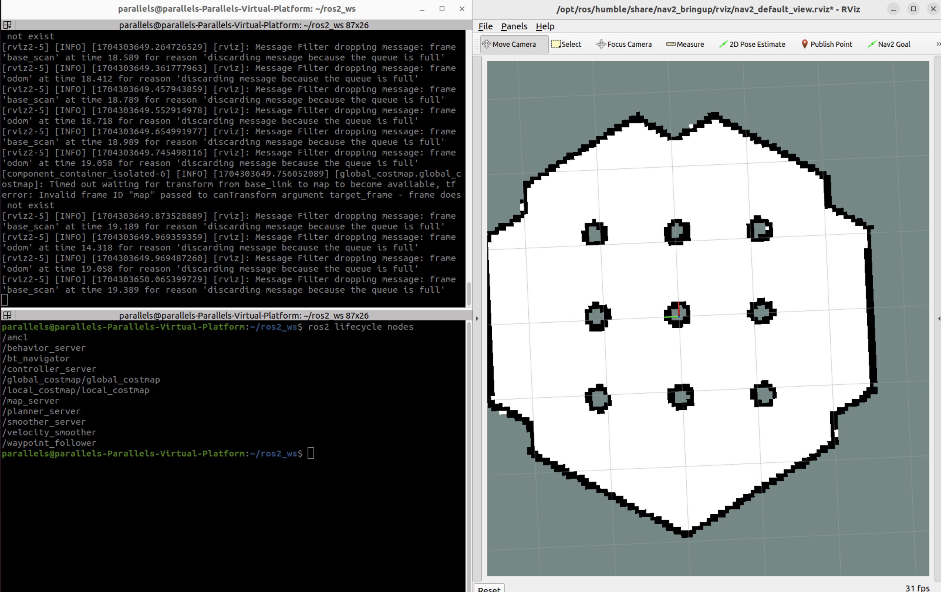 Nav2를 실행했을 때는 lifecycle nodes가 위 사진과 같이 등록되고 맵이 등록되어 있을 때 Inactive 상태이다. 그리고 Initial pose가 지정된다면 모든 Node의 state가 Active로 변경된다.