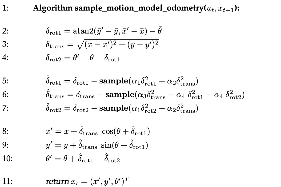 로봇의 움직임에 따라 각각의 particle들도 pose update 해야 된다. 먼저 AMCL에서는 LiDAR 데이터가 들어올 때 TF를 통하여 Odometry pose를 구한 뒤 일정 임계값 이상 움직일 경우 업데이트를 한다. (이렇게 구현한 이유는 resampling 주기와 관련이 있다.) 각각 AmclNode::getOdomPose, AmclNode::shouldUpdateFilter 함수에 구현되어 있다.