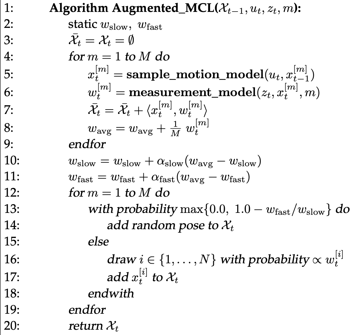 AMCL은 Particle Filter를 이용하여 로봇의 위치를 추정한다. Particle Filter에 대해 간단하게 소개하자면 특정 분포를 가지고 있지 않는 nonparametric 한 모델을 위한 베이즈 필터를 구현한 것이다. 이 포스트는 주요한 아래 4가지를 어떻게 구현하였는지에 초점을 둔다.