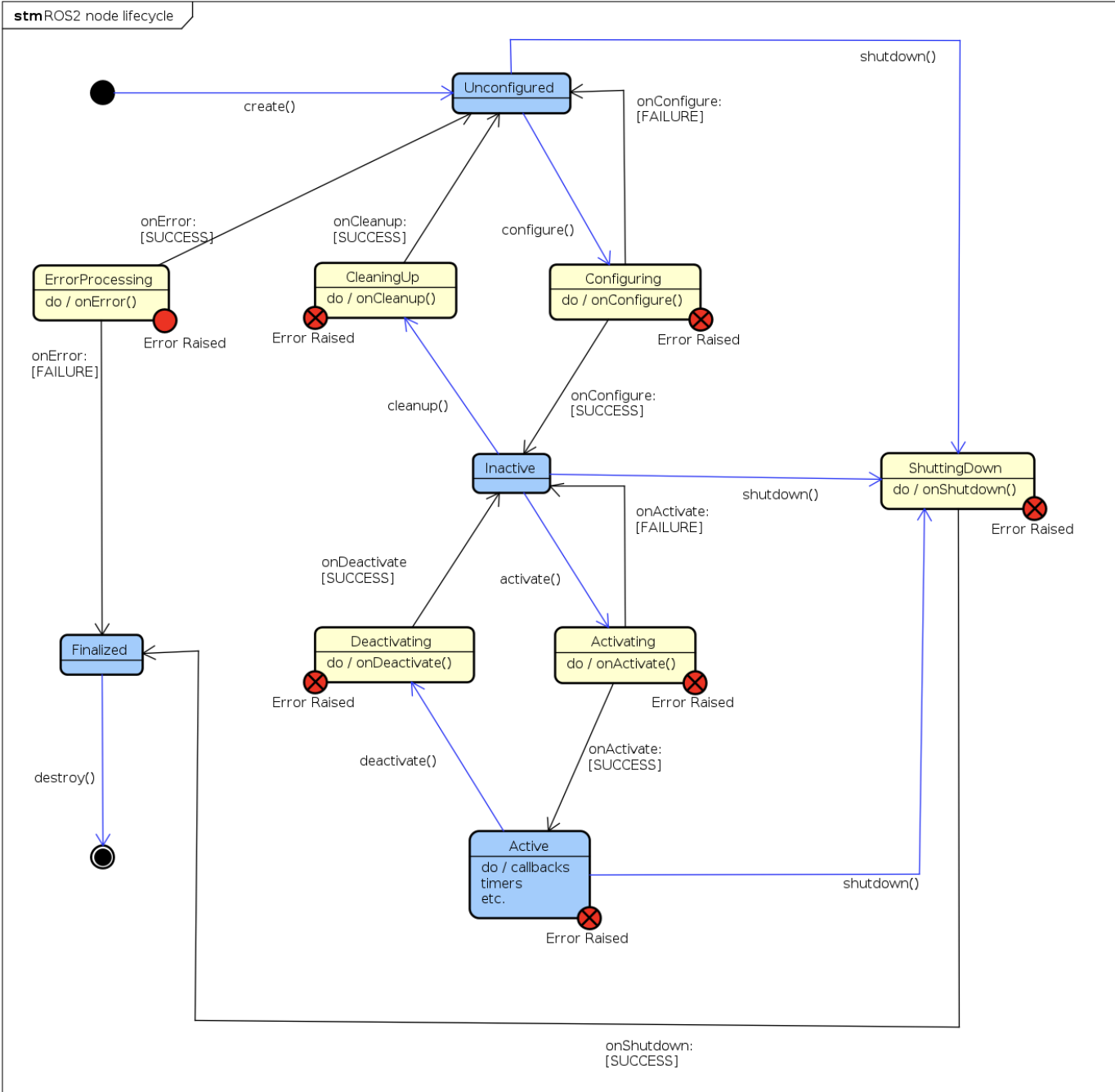 일반적으로 Node를 생성할 때랑 크게 다르지 않다. 자신이 만들 Node에 rclcpp_lifecycle::LifecycleNode를 상속시켜야 한다. 위 코드에서 우리가 주의 깊게 봐야 할 것은 on_configure, on_activate, on_deactivate, on_cleanup, on_shutdown 메서드이다. 각각 Node의 상태가 변경될 때 실행되는 함수들이다. 각각 다음과 같은 상활일때 호출된다.